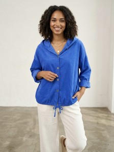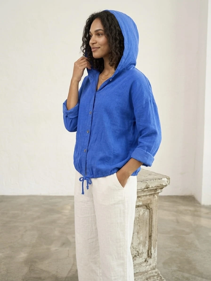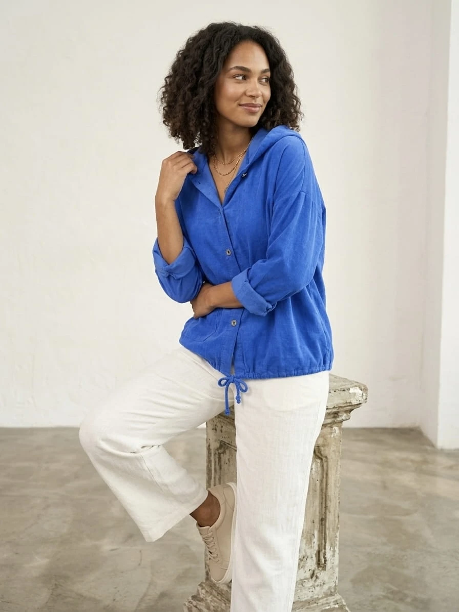 Luźna bluza z kapturem wykonana w 100% z naturalnej bawełny, zapewniającej komfort i przewiewność przez cały dzień. Model zapinany na guziki z praktycznymi kieszeniami oraz długim rękawem, który można swobodnie podwinąć. Dzięki swobodnemu krojowi świetnie układa się na sylwetce i pasuje do wielu codziennych stylizacji.