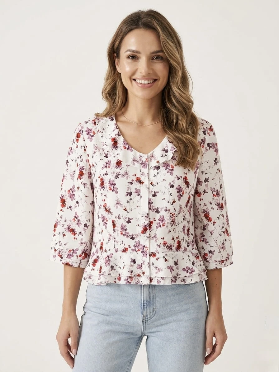 Model zapinany na guziki, z efektowną falbaną z przodu, która podkreśla kobiecy charakter. Rękaw o długości 3/4 zapewnia komfort noszenia przez cały dzień. Materiał jest przyjemny dla skóry, lekko przewiewny i dobrze układa się na sylwetce.