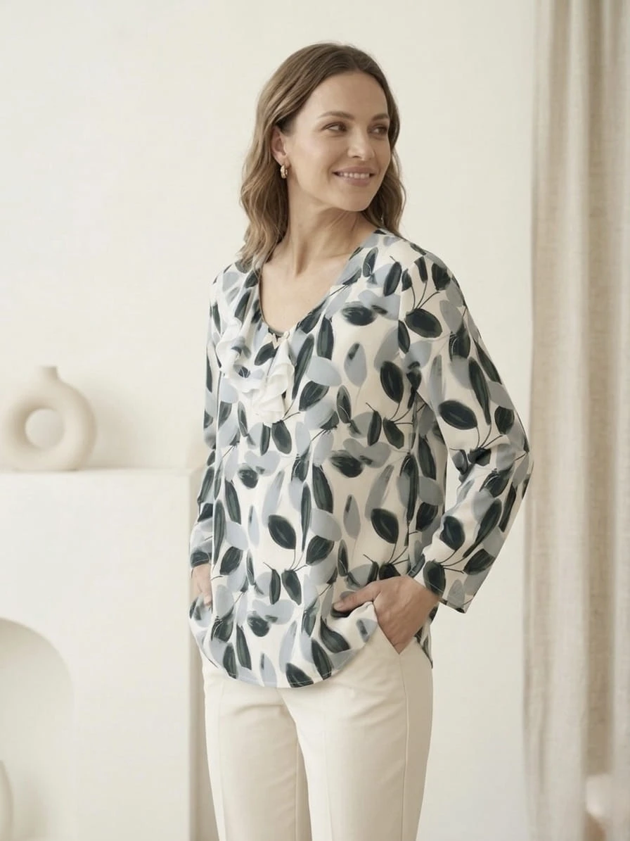 Elegancka bluzka od polskiego producenta, która łączy wygodę z kobiecym stylem. Model o luźniejszym kroju, idealny dla sylwetek plus size – pięknie układa się na ciele i zapewnia swobodę noszenia przez cały dzień. Subtelny, roślinny print w stonowanych odcieniach dodaje świeżości i lekkości stylizacji, a delikatna falbana przy dekolcie nadaje całości wyjątkowego uroku.