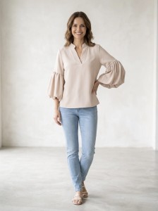 Luźny, lekko opływający fason sprawia, że czujesz się swobodnie, ale jednocześnie wyglądasz kobieco i stylowo. Dekolt w literę V pięknie wysmukla szyję, a rękawy z delikatnym rozszerzeniem dodają lekkości i tego „czegoś”, co przyciąga spojrzenia.