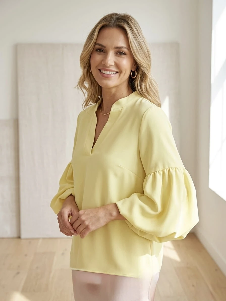 Luźny, lekko opływający fason sprawia, że czujesz się swobodnie, ale jednocześnie wyglądasz kobieco i stylowo. Dekolt w literę V pięknie wysmukla szyję, a rękawy z delikatnym rozszerzeniem dodają lekkości i tego „czegoś”, co przyciąga spojrzenia.