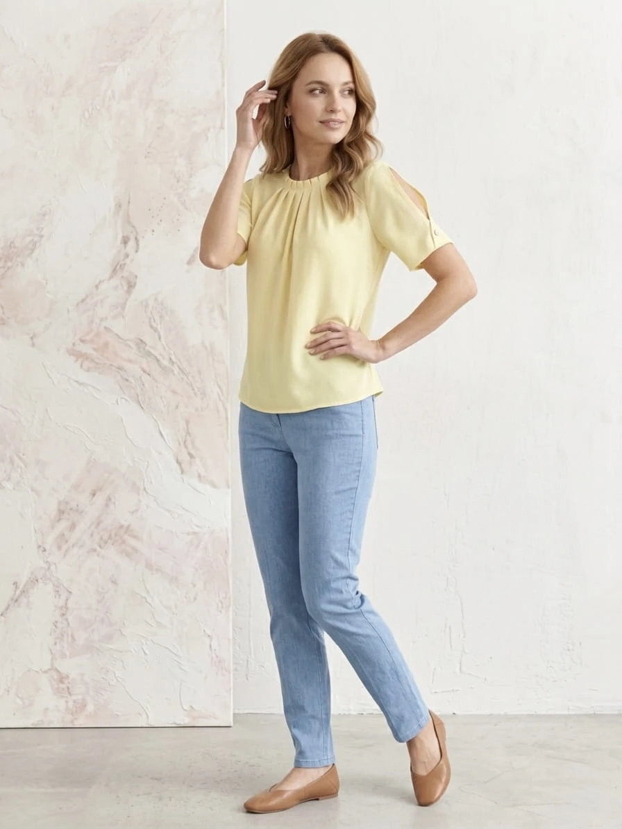 Bluzka dostępna w wielu modnych kolorach – idealnych do pracy, na spotkania czy codzienne wyjścia.
