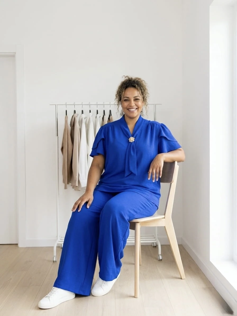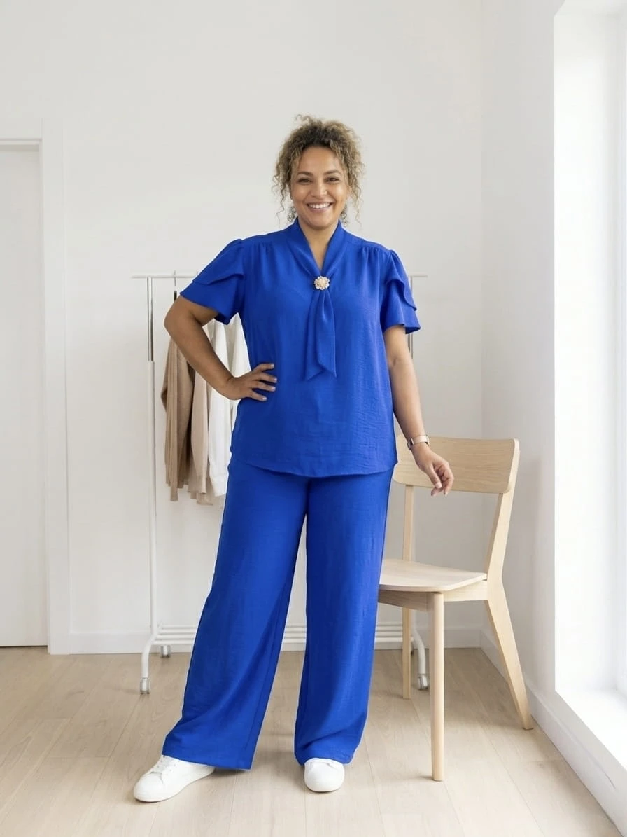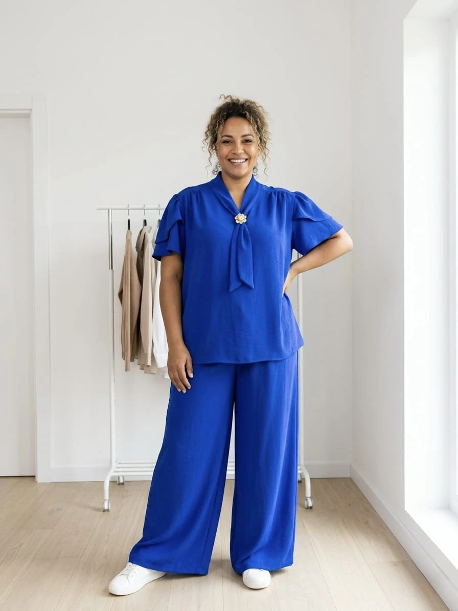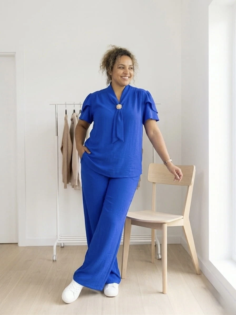 Stylowy i niezwykle komfortowy komplet dla Pań plus size, który łączy elegancję z codzienną wygodą. Wykonany z lekkiego, przewiewnego materiału, pięknie układa się na sylwetce i zapewnia komfort noszenia przez cały dzień.