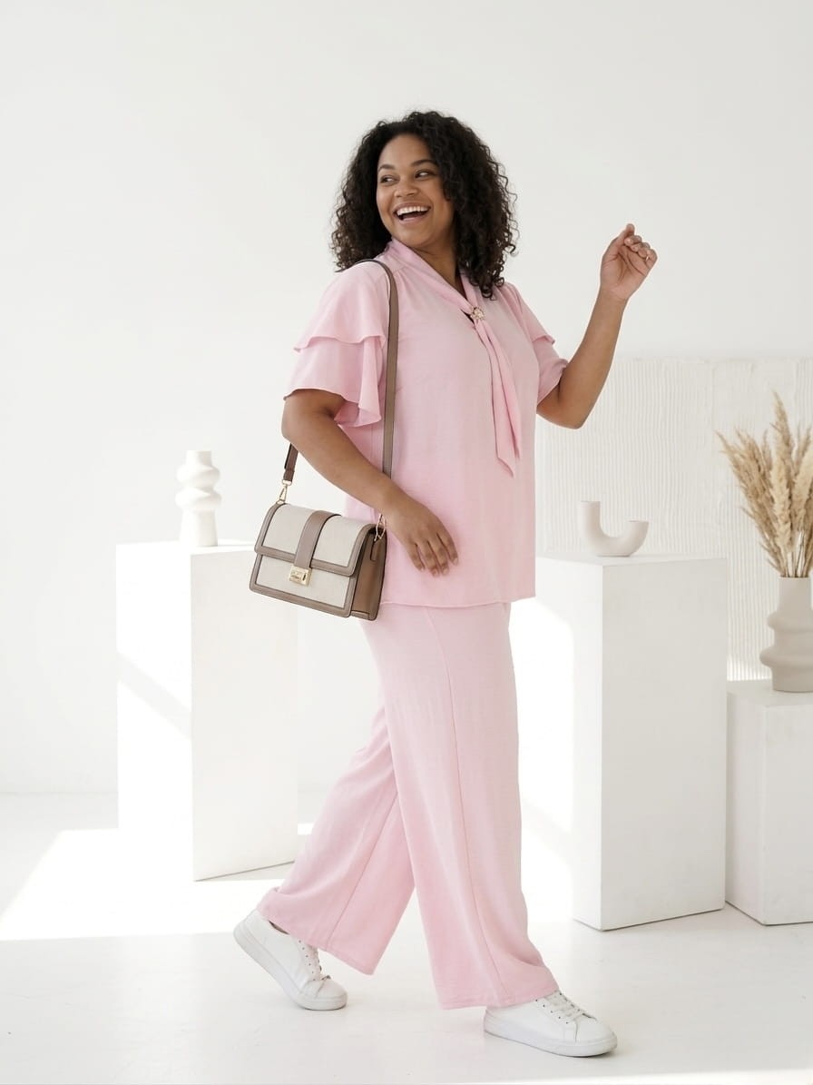 Stylowy i niezwykle komfortowy komplet dla Pań plus size, który łączy elegancję z codzienną wygodą. Wykonany z lekkiego, przewiewnego materiału, pięknie układa się na sylwetce i zapewnia komfort noszenia przez cały dzień.