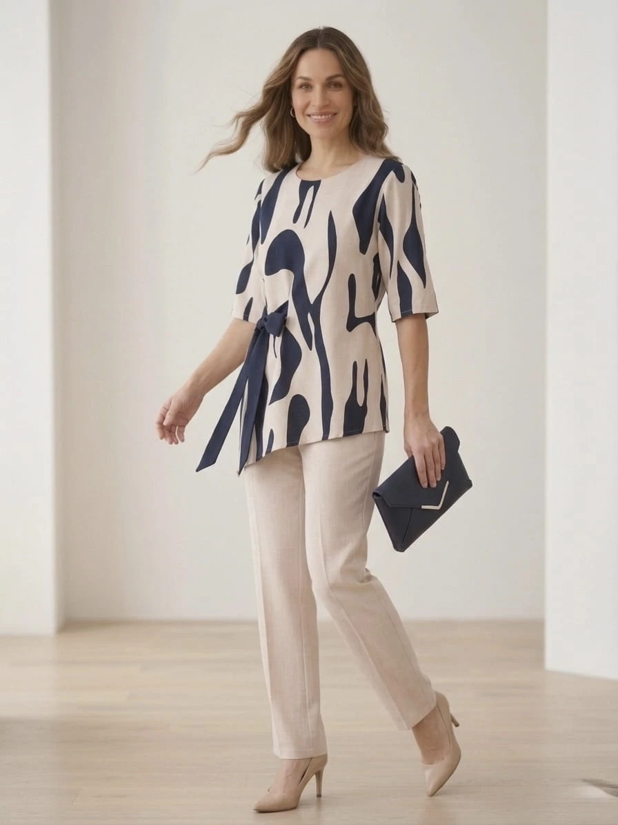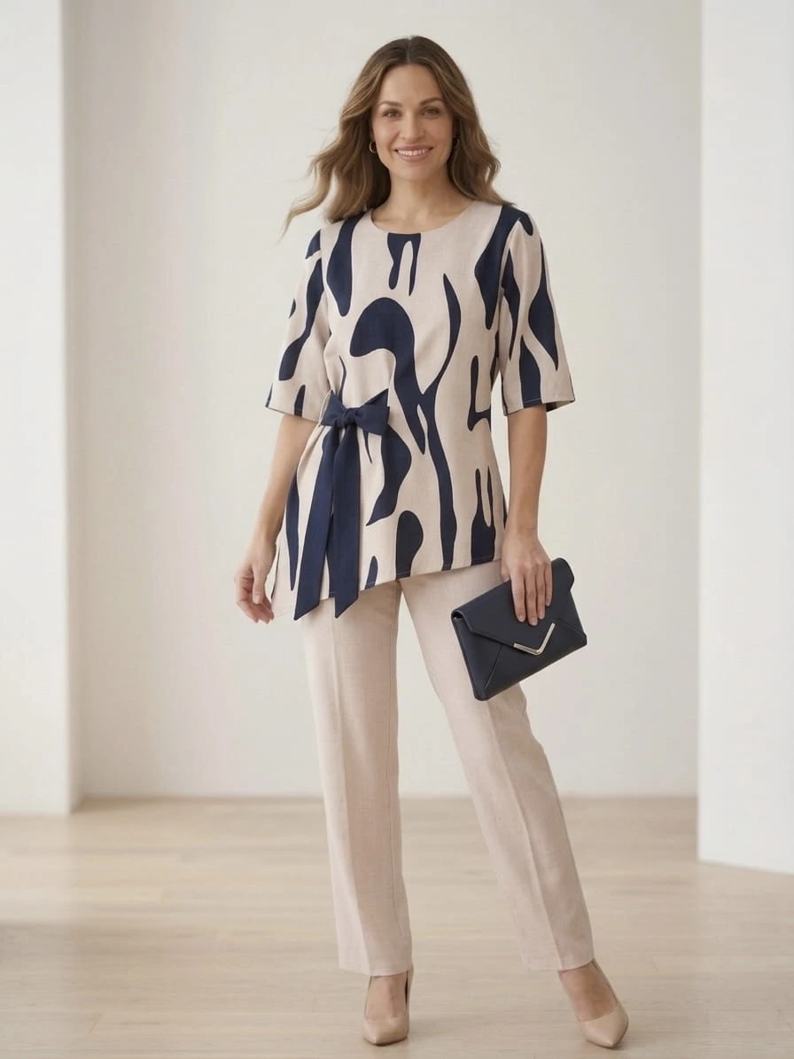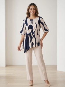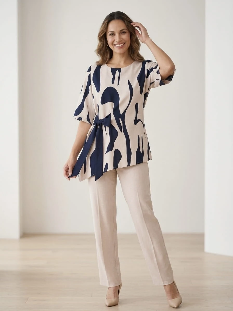 Elegancki komplet damski plus size w modnym, beżowo-granatowym kolorze to doskonała propozycja dla kobiet, które cenią wygodę i styl w codziennych stylizacjach. Zestaw składa się z luźnej bluzki wiązanej w talii oraz spodni z prostą, szeroką nogawką, które pięknie układają się na sylwetce i zapewniają swobodę ruchów. Lekki, przyjemny w dotyku materiał gwarantuje komfort noszenia przez cały dzień, a swobodny fason subtelnie maskuje niedoskonałości sylwetki. Ten komplet w dużych rozmiarach świetnie sprawdzi się zarówno na co dzień, na spacer czy spotkanie, tworząc modną i wygodną stylizację dla kobiet plus size.