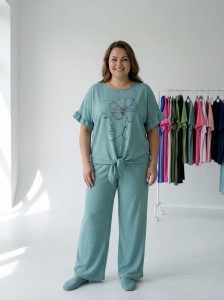 Ten stylowy komplet to idealne połączenie wygody i kobiecego luzu. Miękka, przyjemna w dotyku tkanina (50% poliester, 45% wiskoza, 5% elastan) pięknie układa się na sylwetce i zapewnia swobodę przez cały dzień. Bluzka z modnym nadrukiem i wiązaniem oraz luźne spodnie z elastyczną talią tworzą zestaw, w którym poczujesz się swobodnie i stylowo – zarówno w domu, jak i na wyjściu.