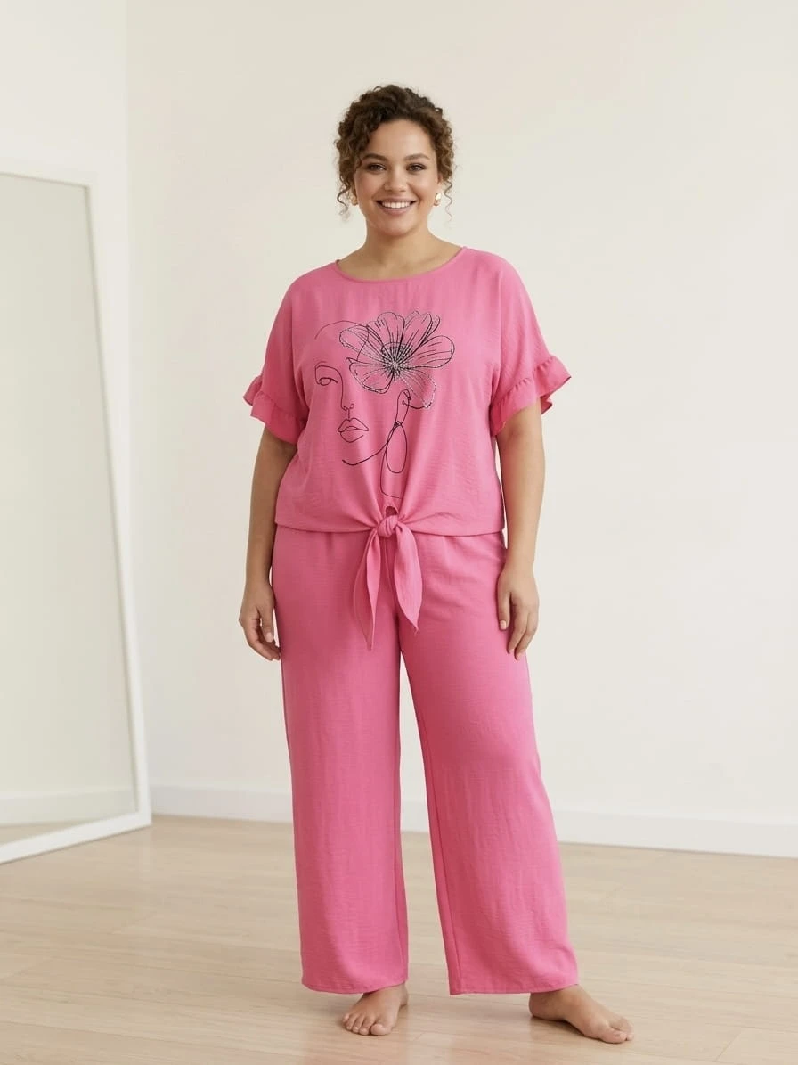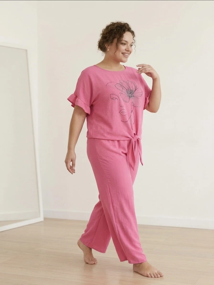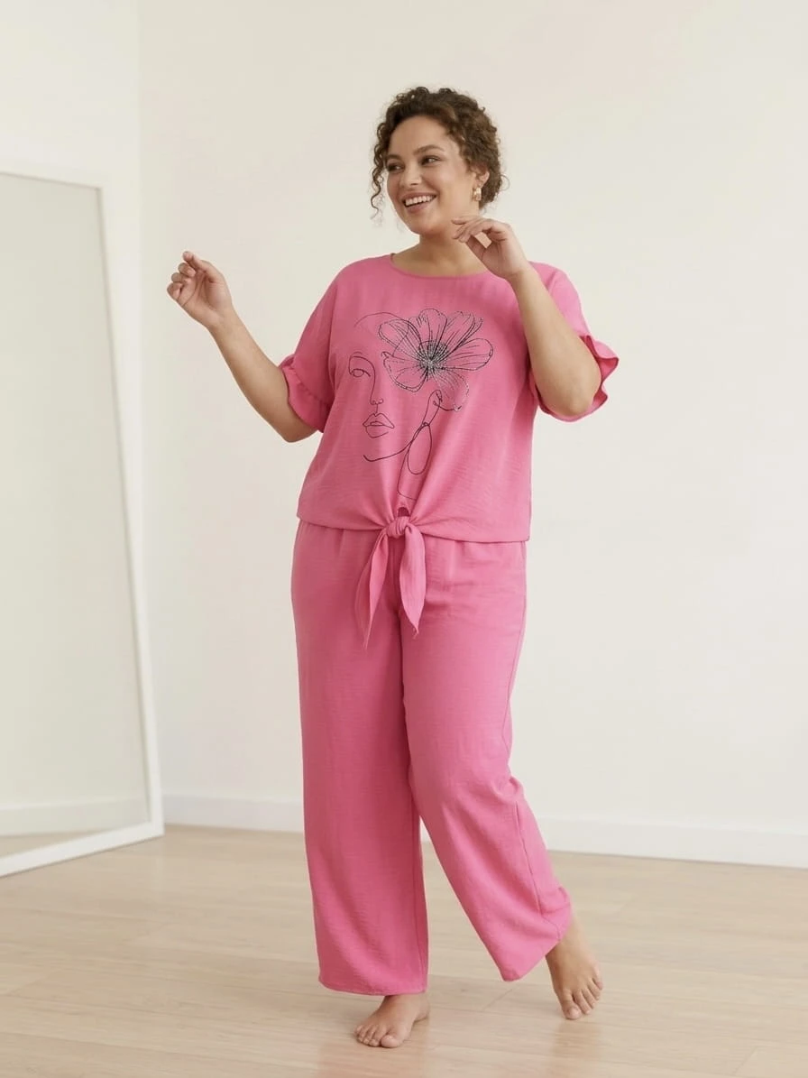 Ten stylowy komplet to idealne połączenie wygody i kobiecego luzu. Miękka, przyjemna w dotyku tkanina (50% poliester, 45% wiskoza, 5% elastan) pięknie układa się na sylwetce i zapewnia swobodę przez cały dzień. Bluzka z modnym nadrukiem i wiązaniem oraz luźne spodnie z elastyczną talią tworzą zestaw, w którym poczujesz się swobodnie i stylowo – zarówno w domu, jak i na wyjściu.