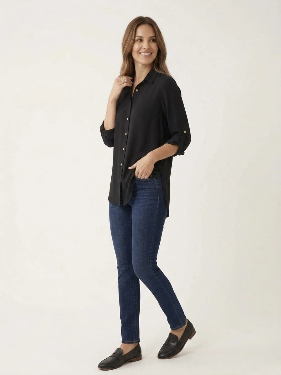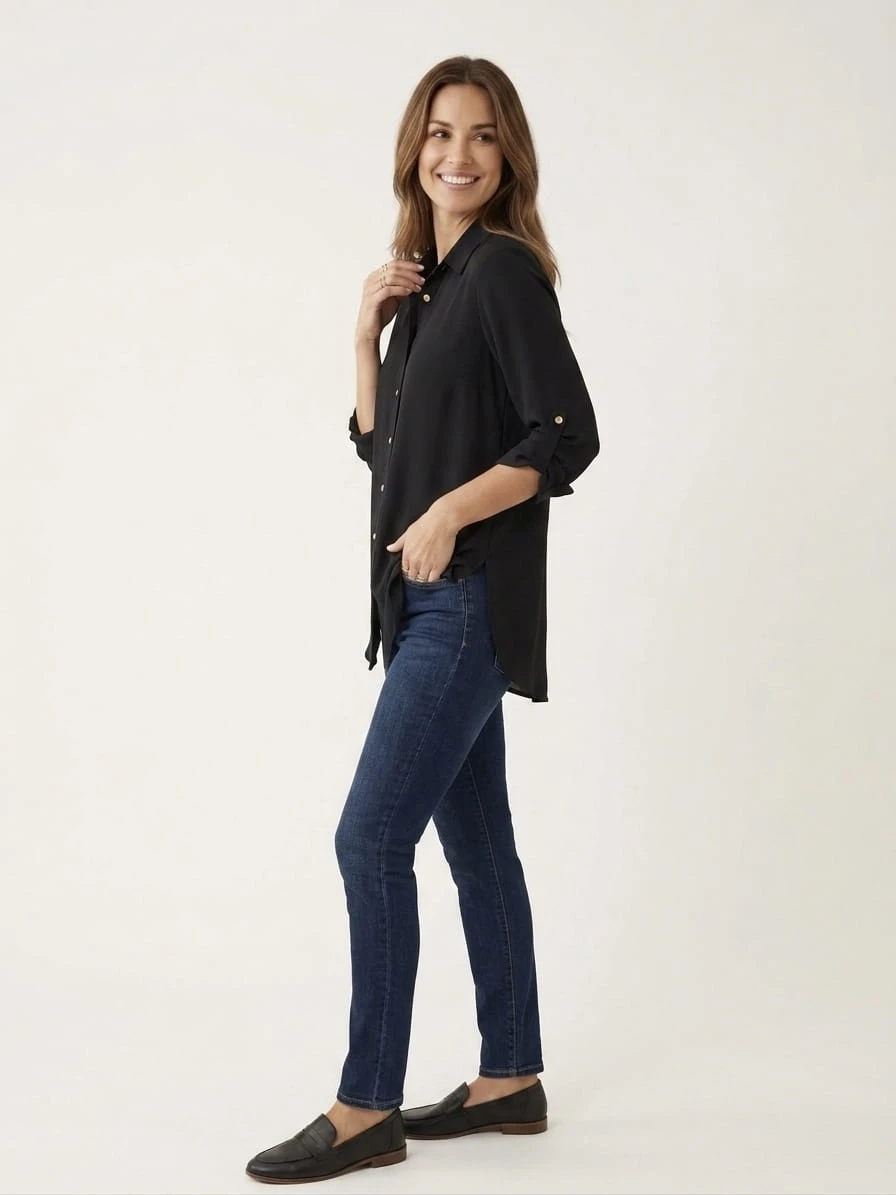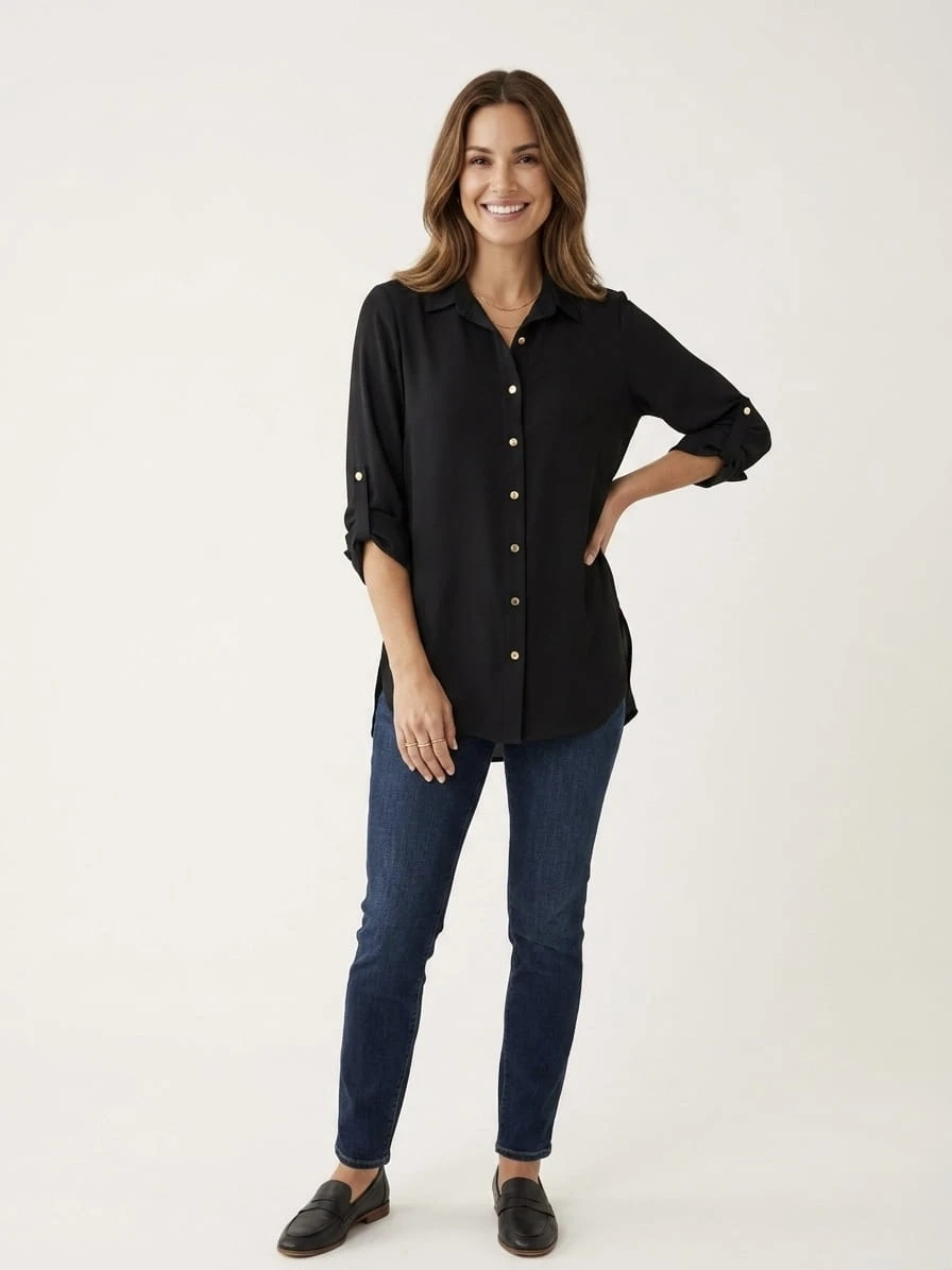 Dłuższy fason sprawia, że koszula jest niezwykle praktyczna – możesz nosić ją zarówno wpuszczoną do spodni czy spódnicy, jak i swobodnie wypuszczoną na zewnątrz, tworząc bardziej casualowy look. Idealna do pracy, na spotkania i na co dzień.