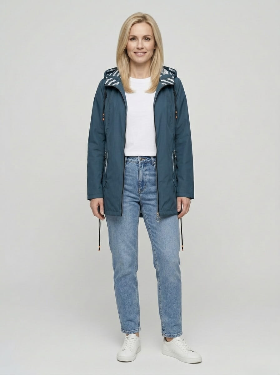 Boczne troczki ściągające – pozwalają delikatnie regulować szerokość kurtki w dolnej części i podkreślić talię.