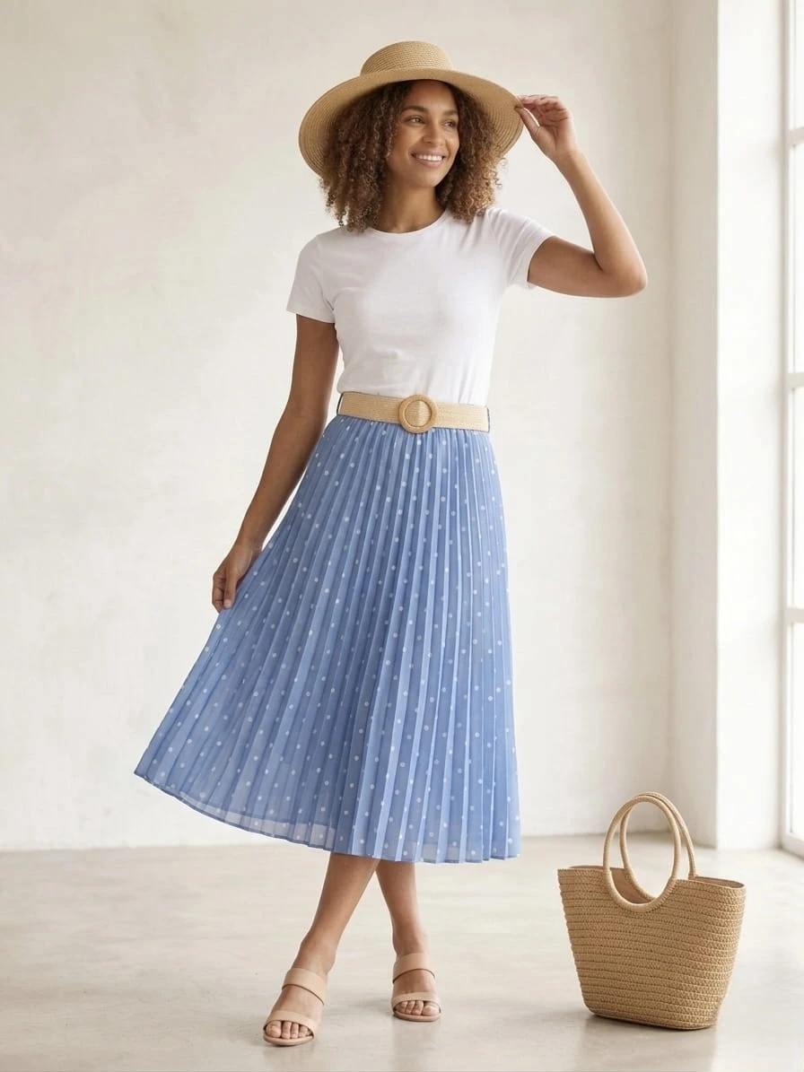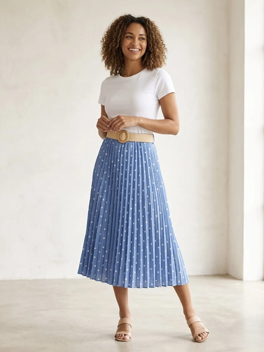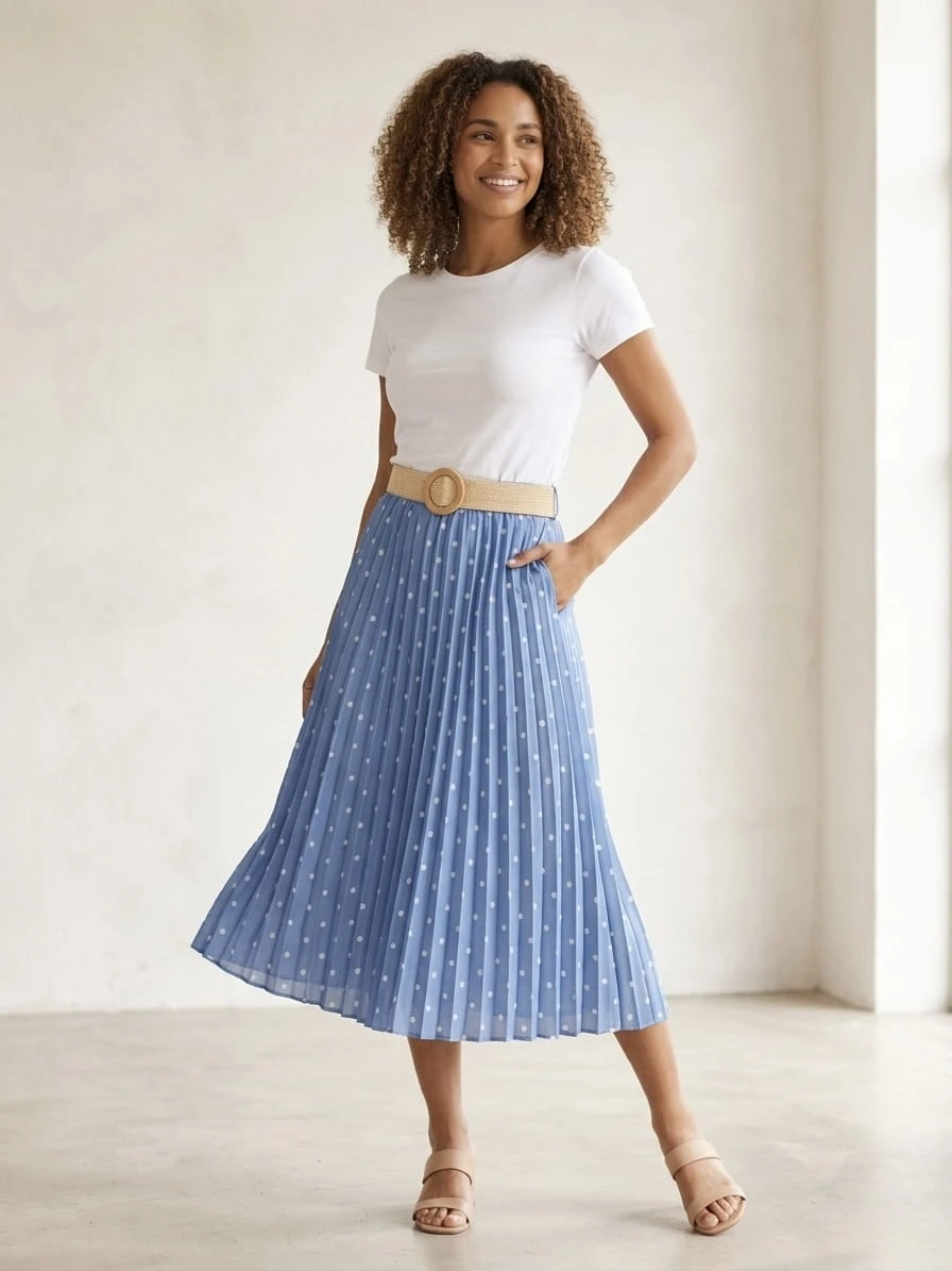 Elegancka i bardzo kobieca spódnica plisowana, która świetnie sprawdzi się zarówno na co dzień, jak i na bardziej eleganckie wyjścia. Lekki, przyjemny w dotyku materiał pięknie układa się w ruchu, a ponadczasowy wzór w groszki dodaje stylizacji klasy i uroku.
