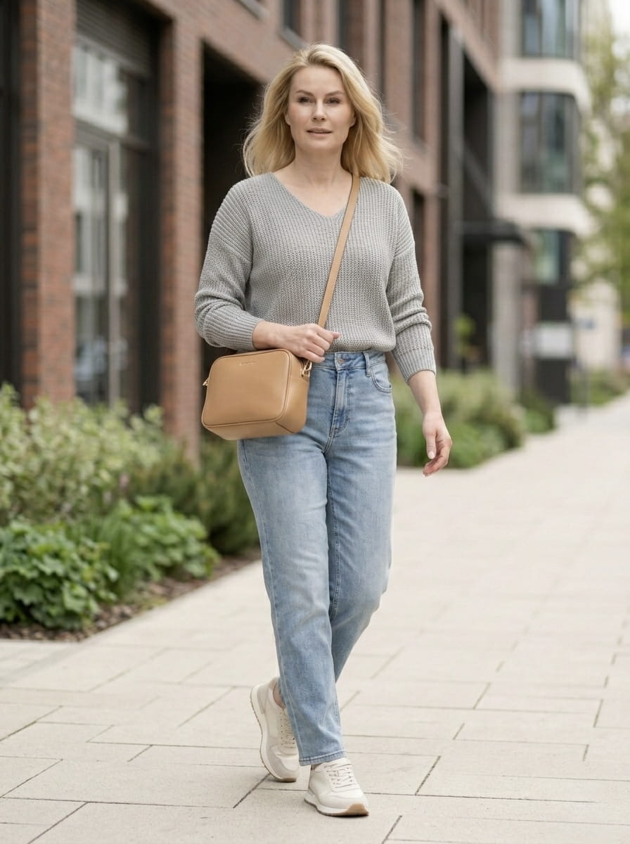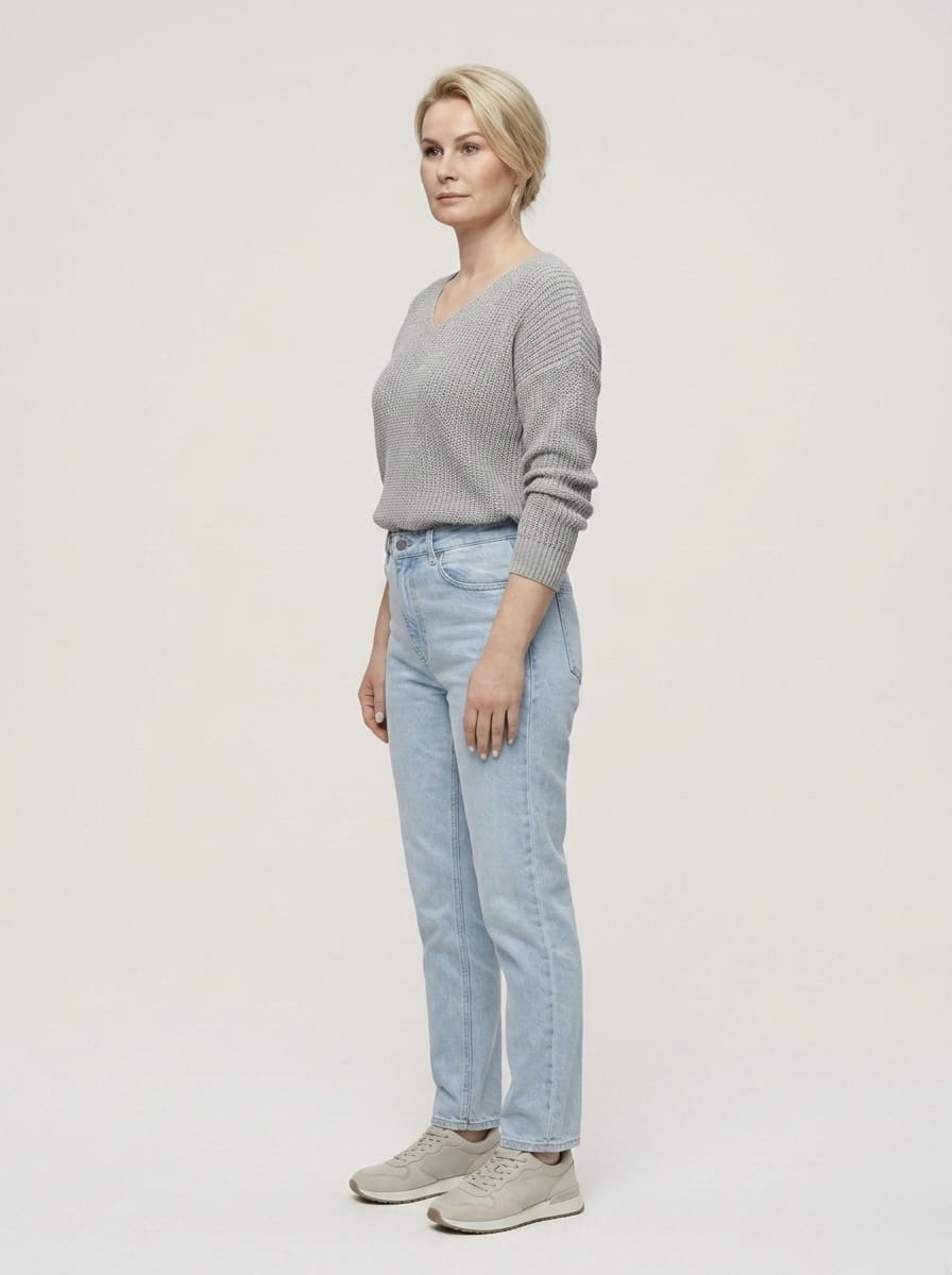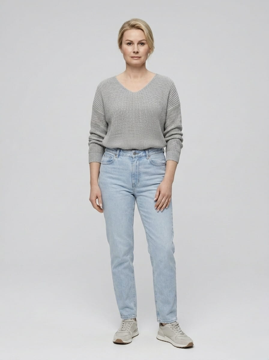• Fason: Swobodny krój typu oversize z subtelnym dekoltem w serek, który optycznie wydłuża szyję.